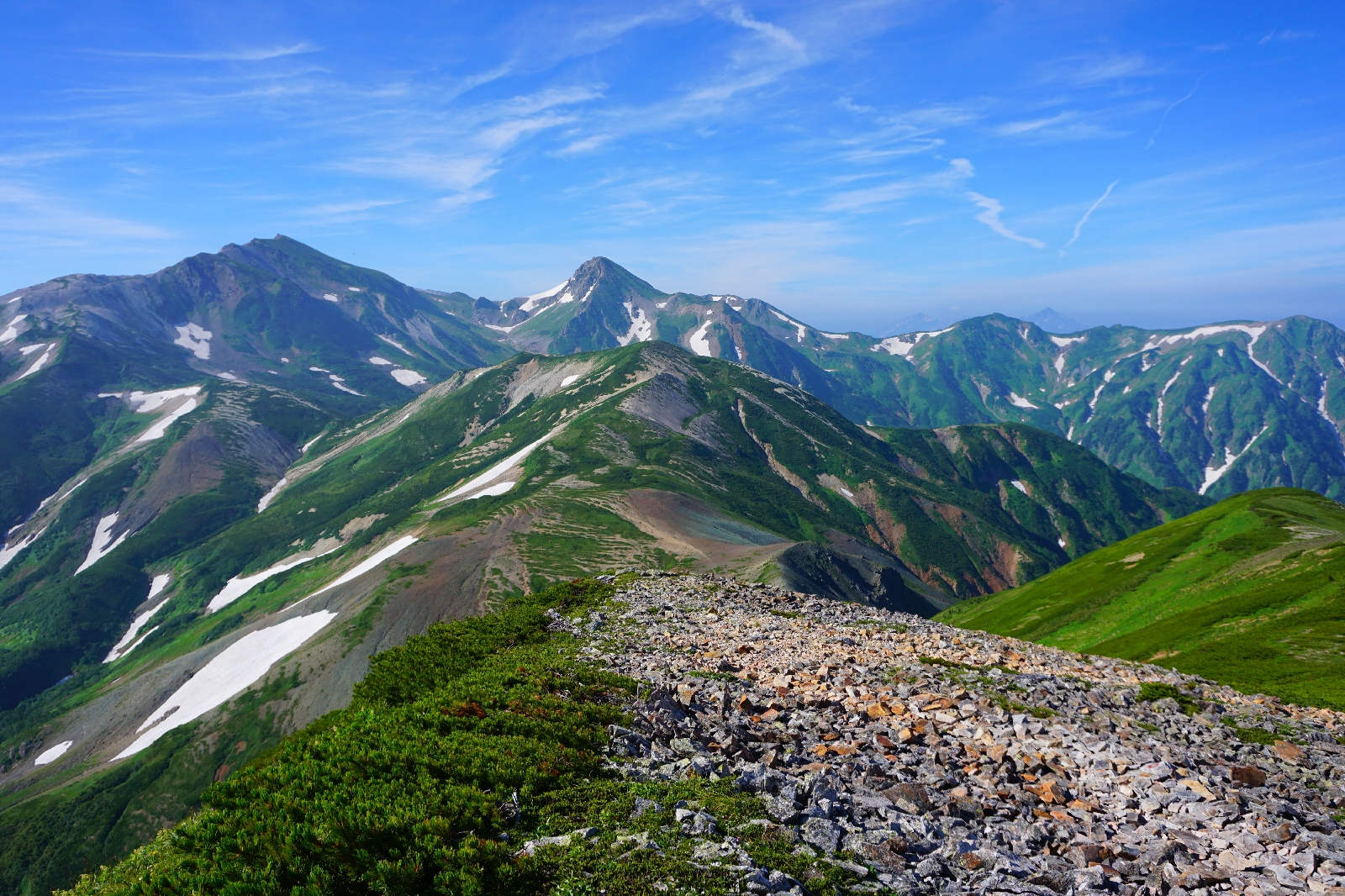振り返ると後立山連峰の大絶景。右から白馬岳&ほか白馬三山、そして唐松岳、五竜岳、鹿島槍ヶ岳と続いていく…。稜線からは目を凝らすと槍の穂先も見えた。北ア最北の大展望台。
